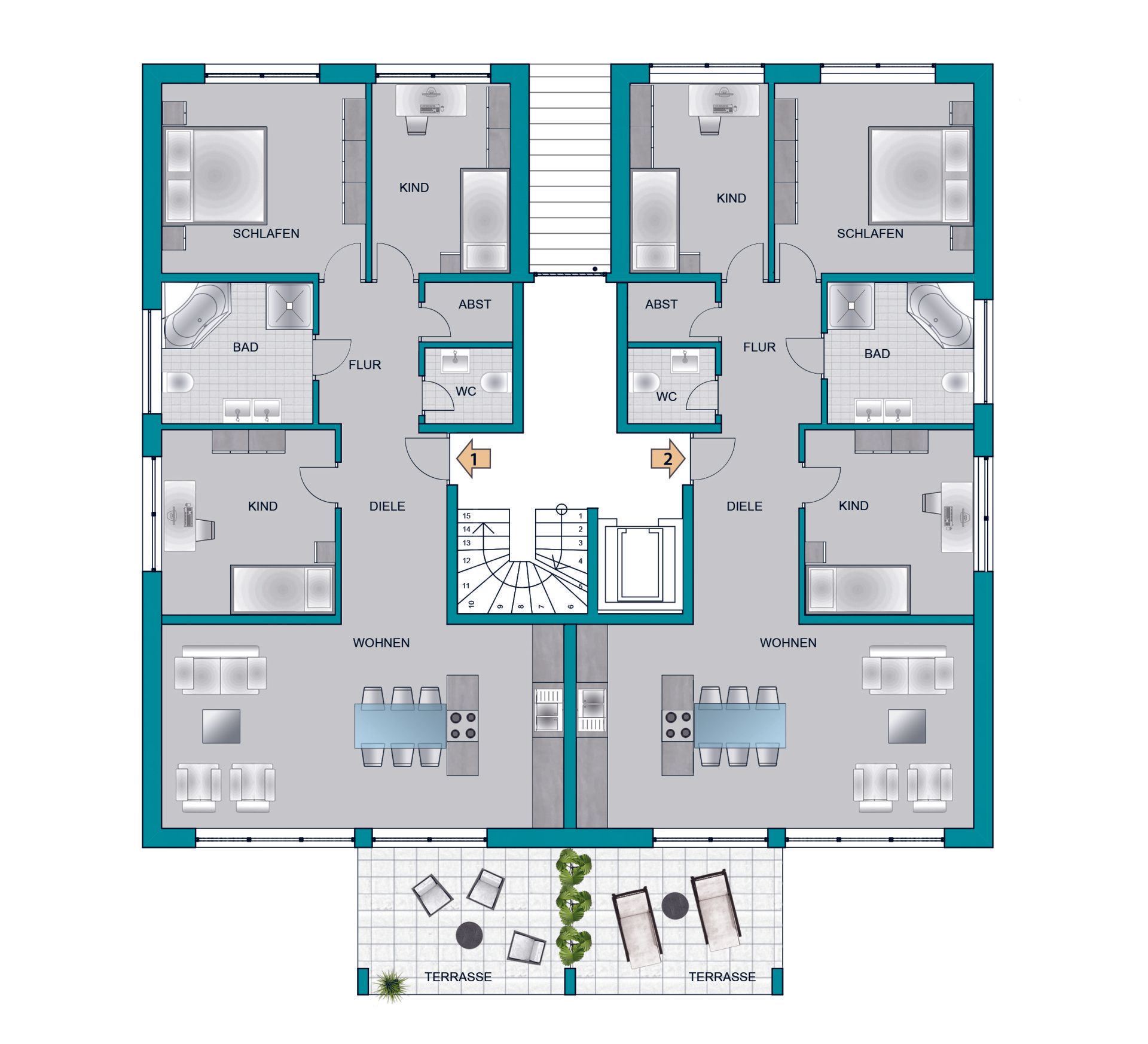 - Alle Zimmer verfügen über individuell steuerbare Fußbodenheizungen